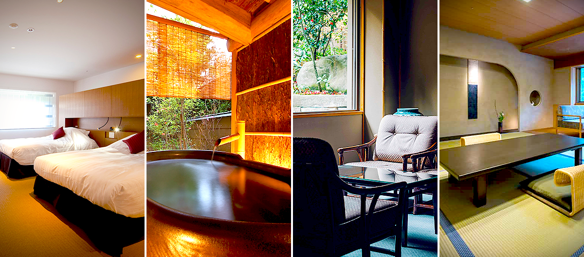 A variety of room types are offered. Japanese-style Superior guest rooms have view of mountain forest, some also have private open-air baths. Western & Japanese-style Room offer a mix of tradition and modern comfort. Renovated Japanese-style Standard guest rooms combine traditional ryokan elegance with a new style. Western-style guest rooms with beds and other modern comforts. Nishimuraya Hotel Shogetsutei is non-smoking.